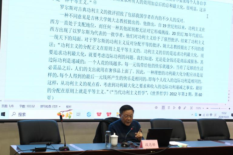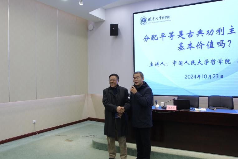 段忠桥教授依据罗尔斯、边沁、穆勒和西季威克的相关理论,论述了“分配平等是古典功利主义追求的基本价值”这一观点是站不住脚的。段忠桥教授围绕“罗尔斯对于古典功利主义的批评以及国内学者的研究现状”“边沁认为分配平等只具有相对价值,只是立法者追求的最终目标--社会幸福的手段”“穆勒认为平等的准则绝不是人们普遍予以应用或认为普遍适用的规则,他屈从于每个人对社会利益的看法”“西季威克有关幸福手段的社会分配论述”等方面进行详细阐述和论证并得出最后结论。段忠桥教授还就同学们感兴趣的问题进行了现场回答和深入讲解。